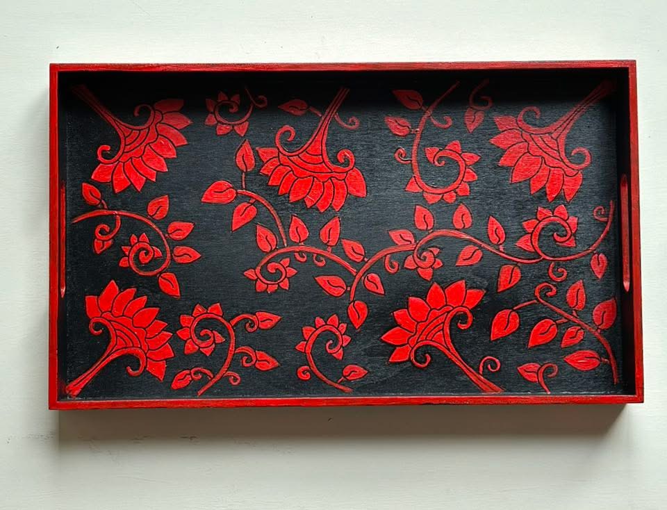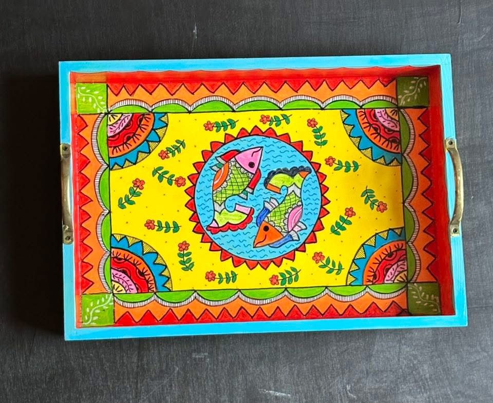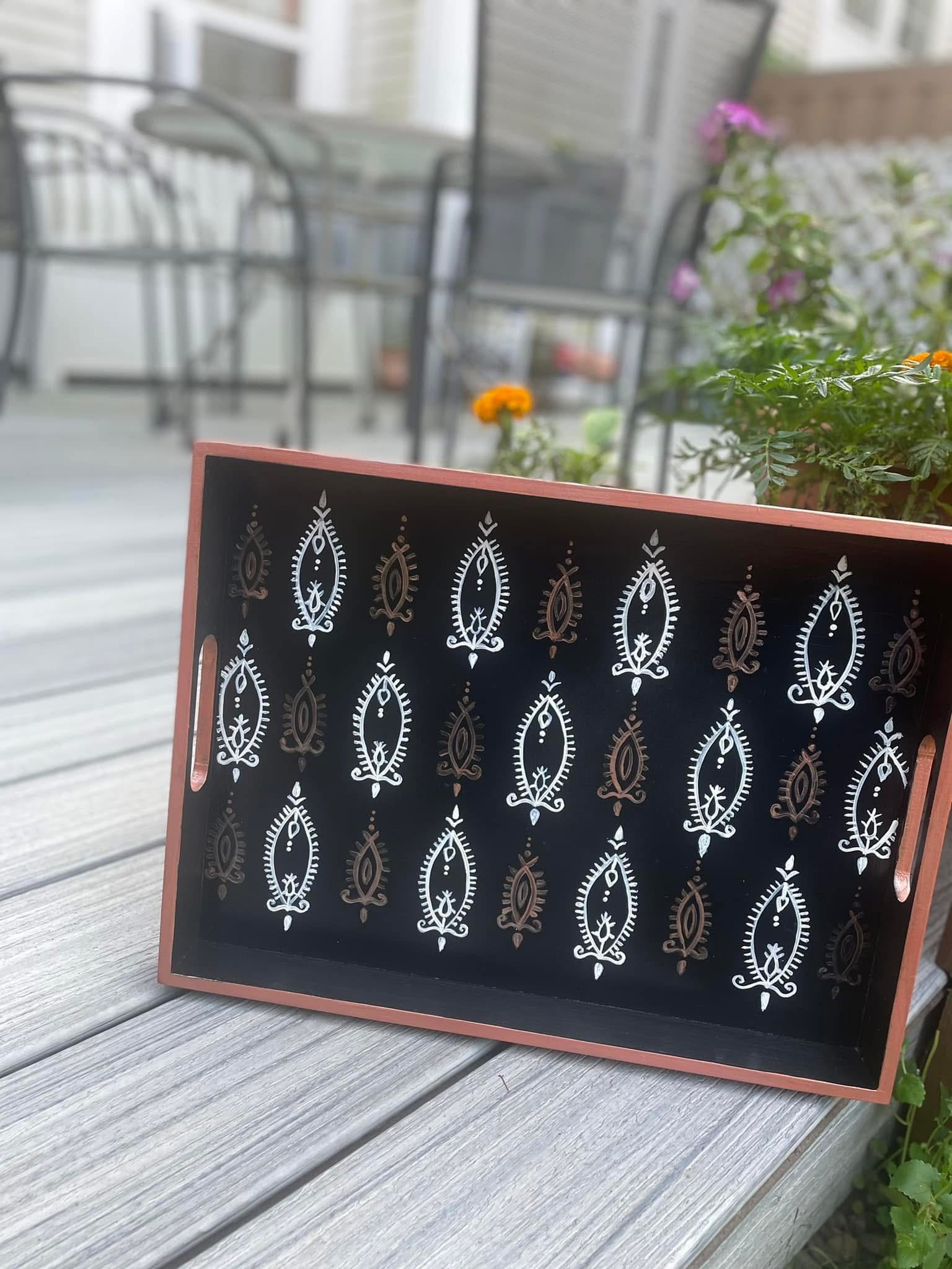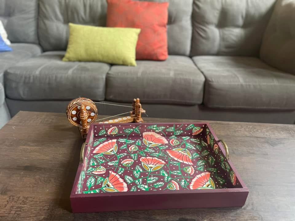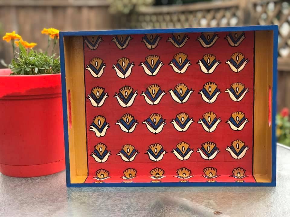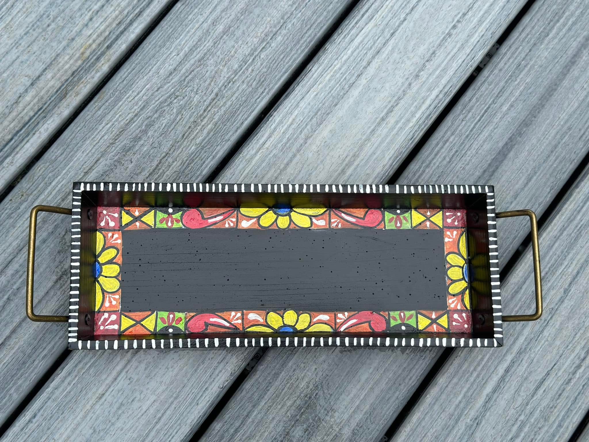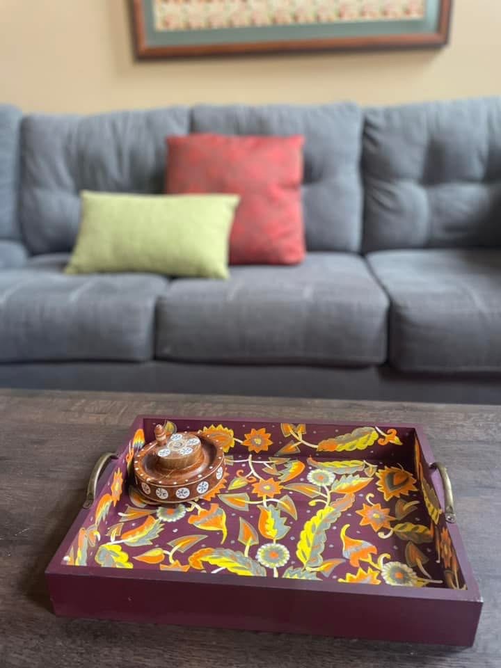 This rectangular,handpainted wood tray is ideal for serving snacks or pretty much anything. It can also serve as a centerpiece on a coffee table in your home or office. Available in three sizes .