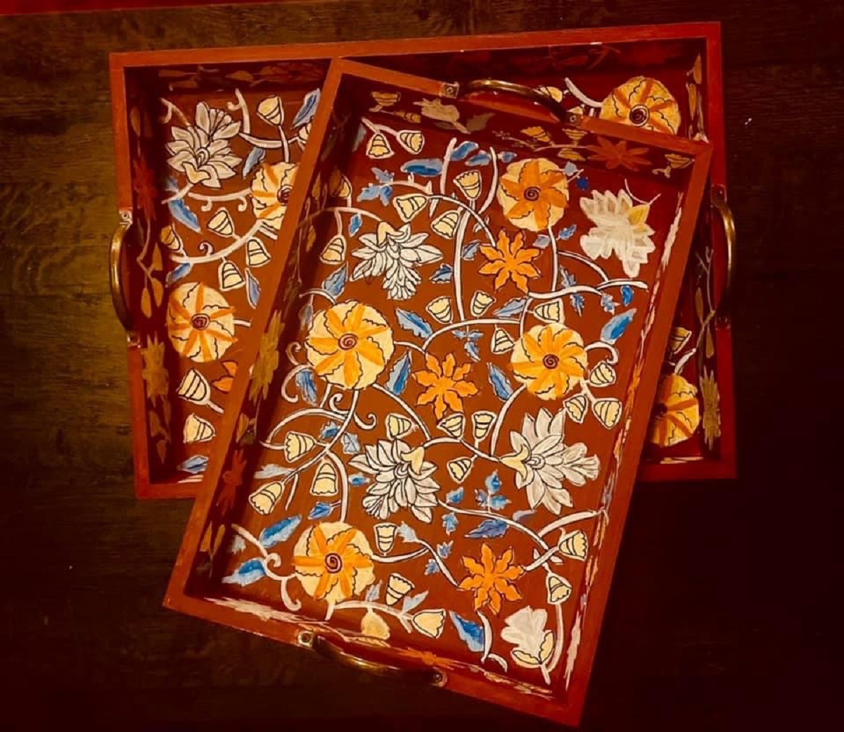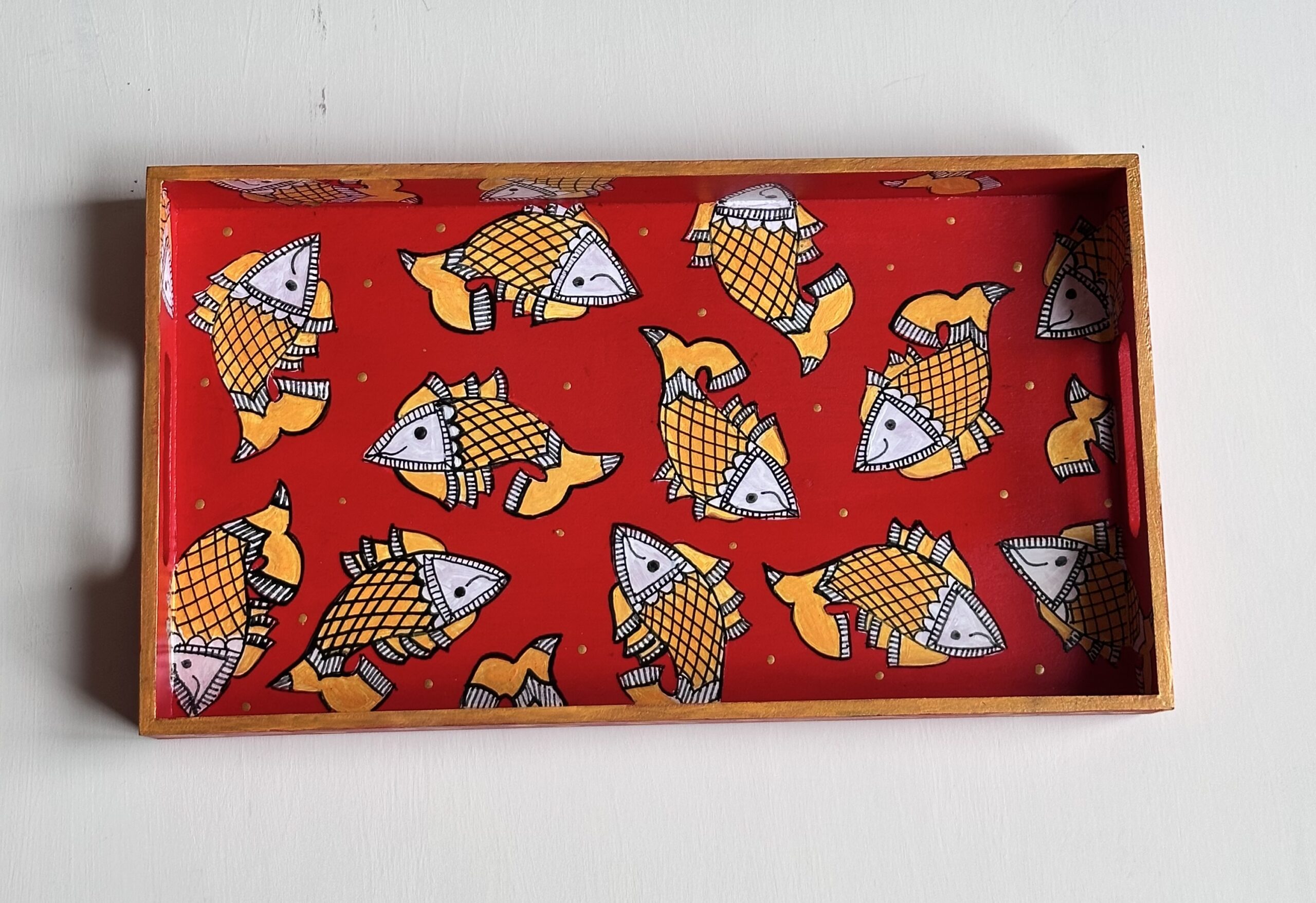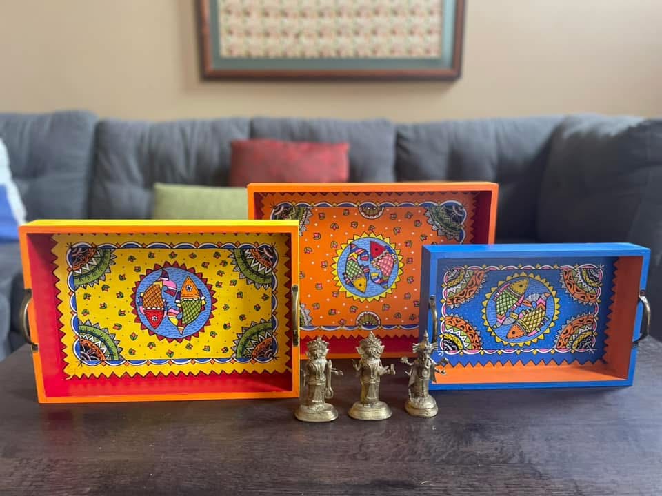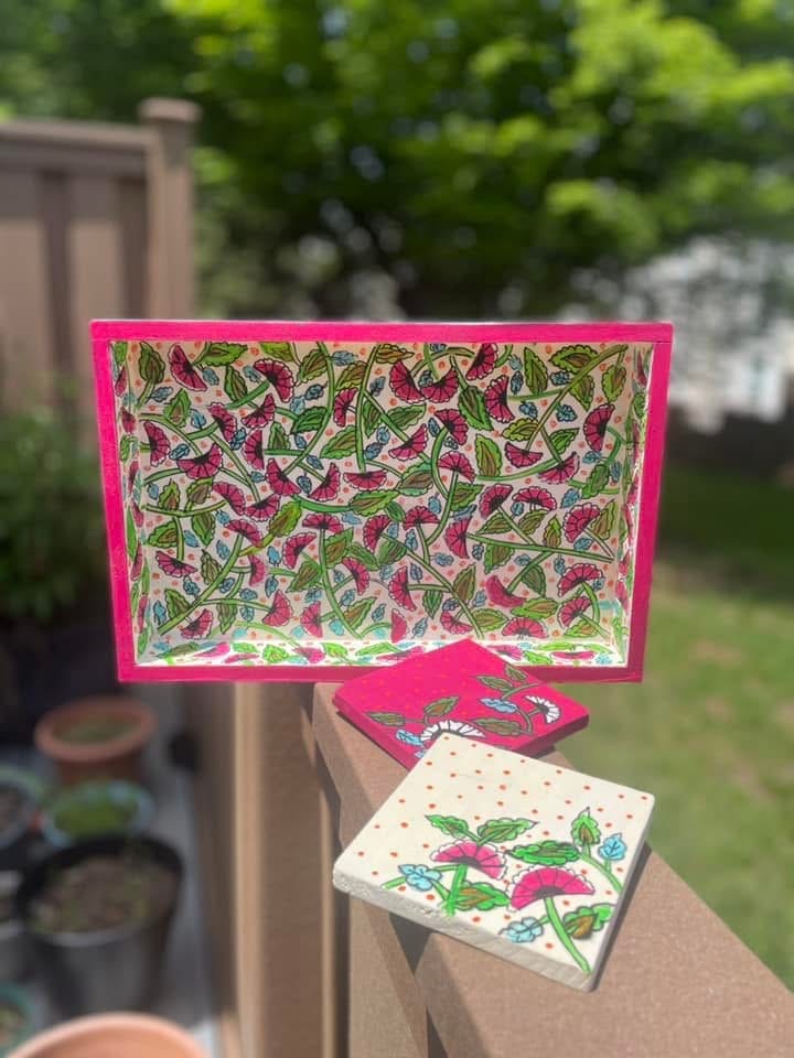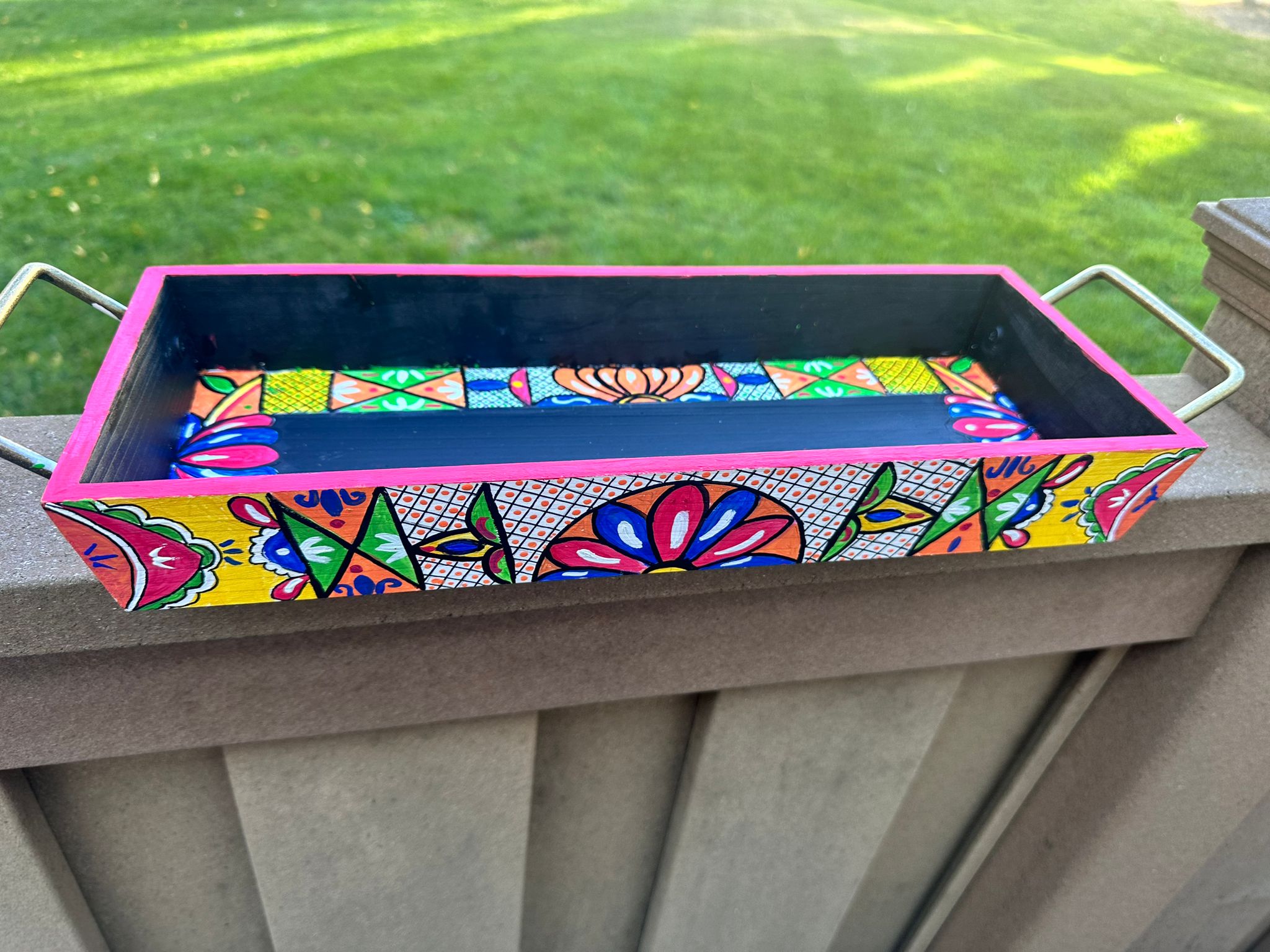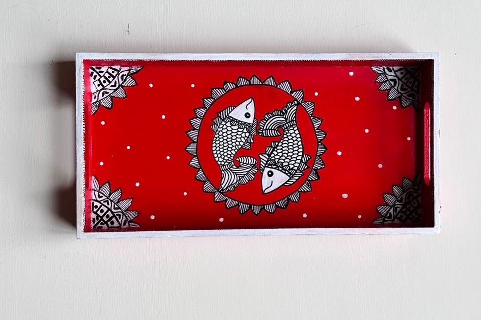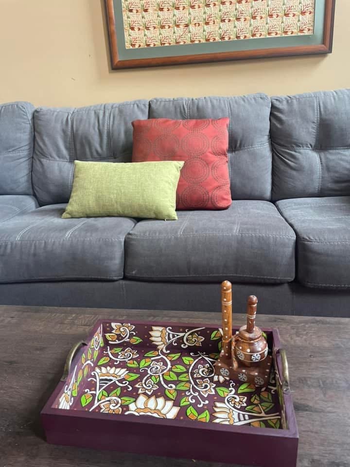 This rectangular,handpainted wood tray is ideal for serving snacks or pretty much anything. It can also serve as a centerpiece on a coffee table in your home or office. Available in three sizes .