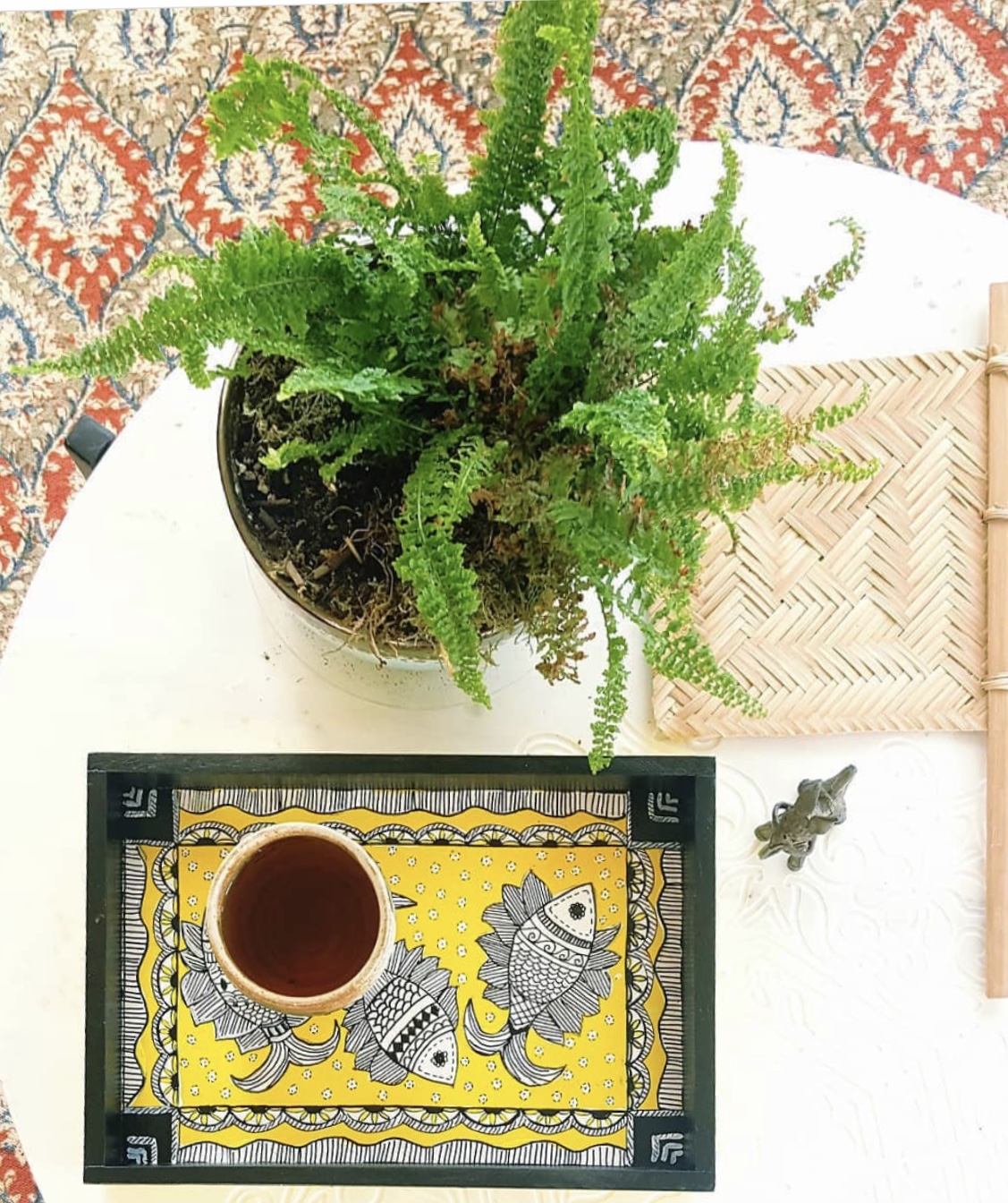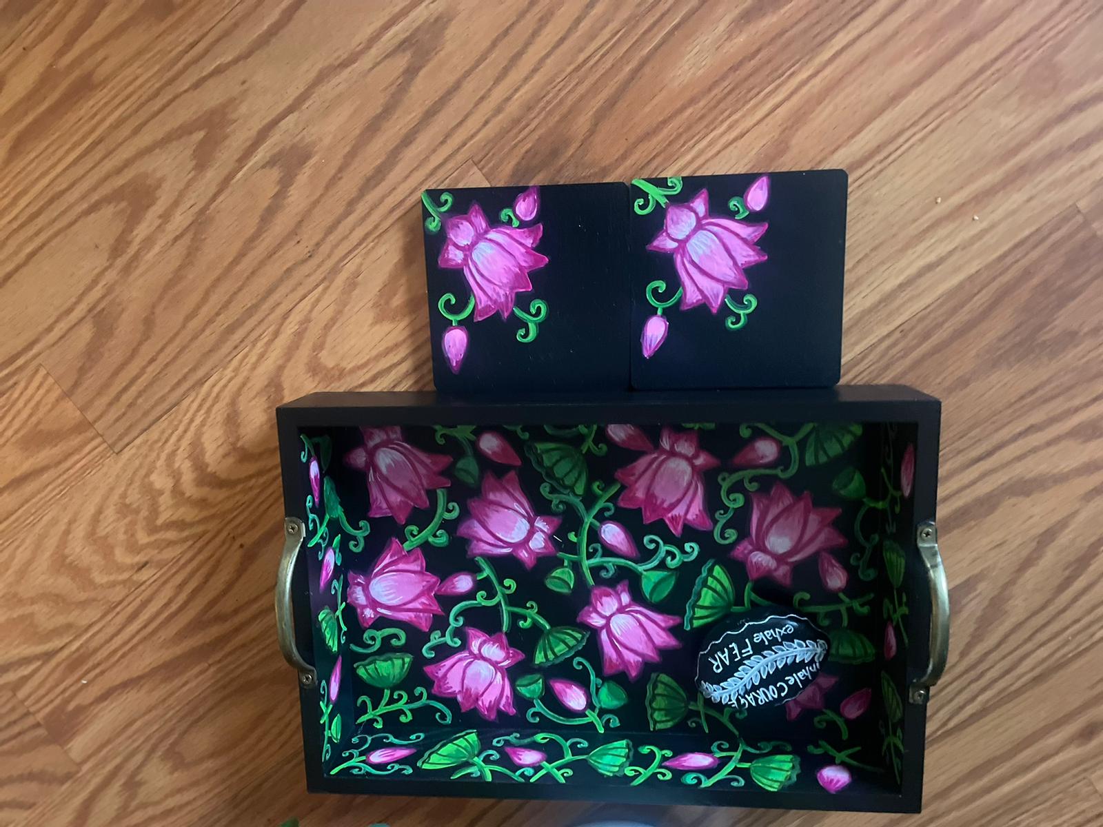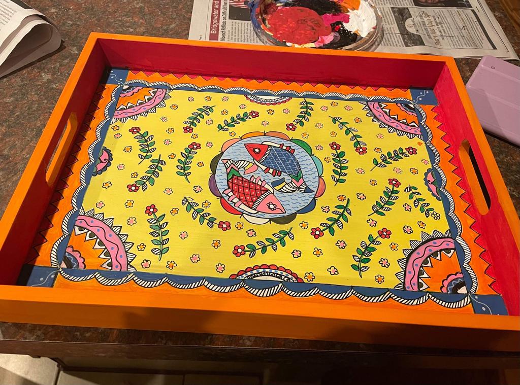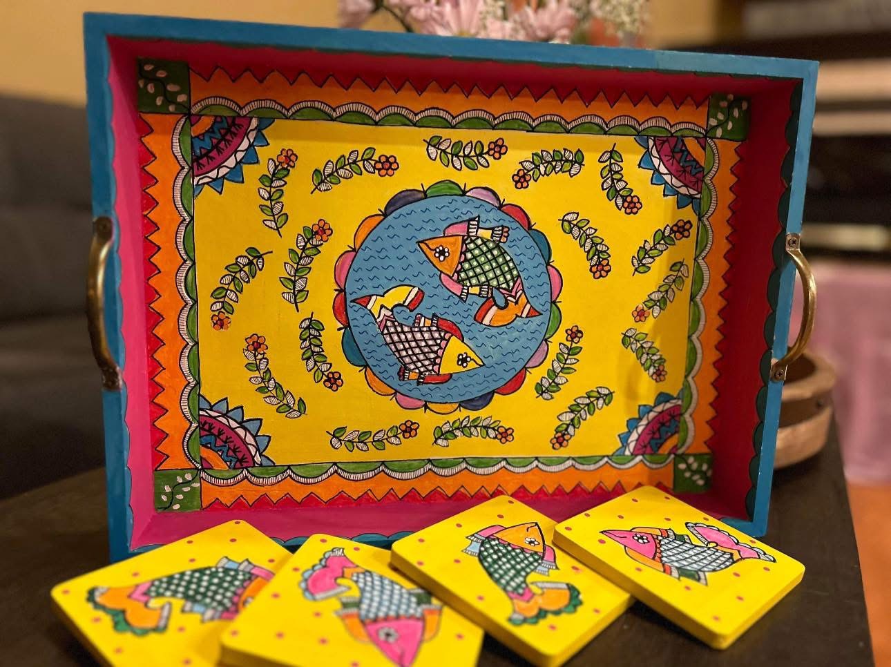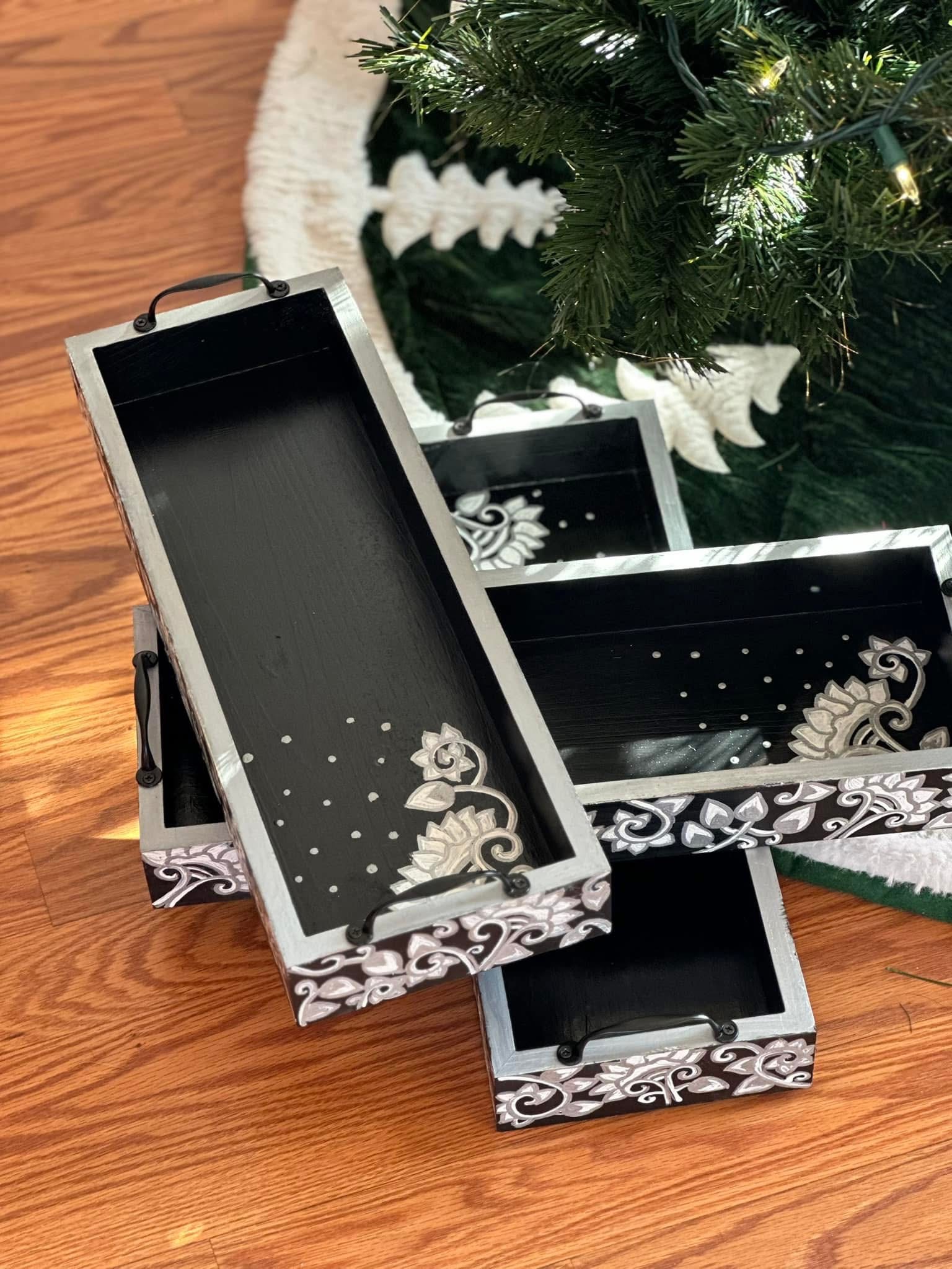 This rectangular,handpainted wood tray is ideal for serving snacks or pretty much anything. It can also serve as a centerpiece on a coffee table in your home or office. Available in three sizes .